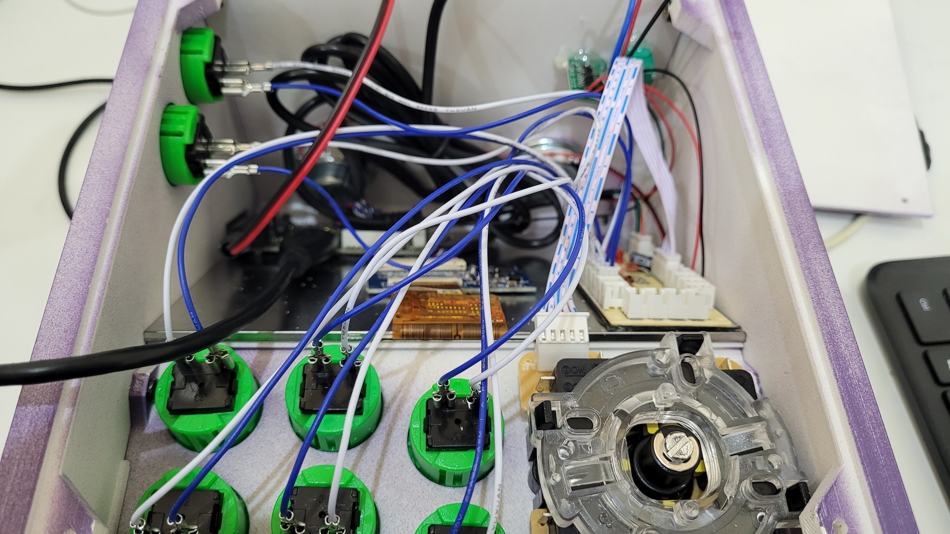 At this point, the last thing to wire was all the buttons as well as the stick: here is an overview of all hardware parts mounted and wired :
